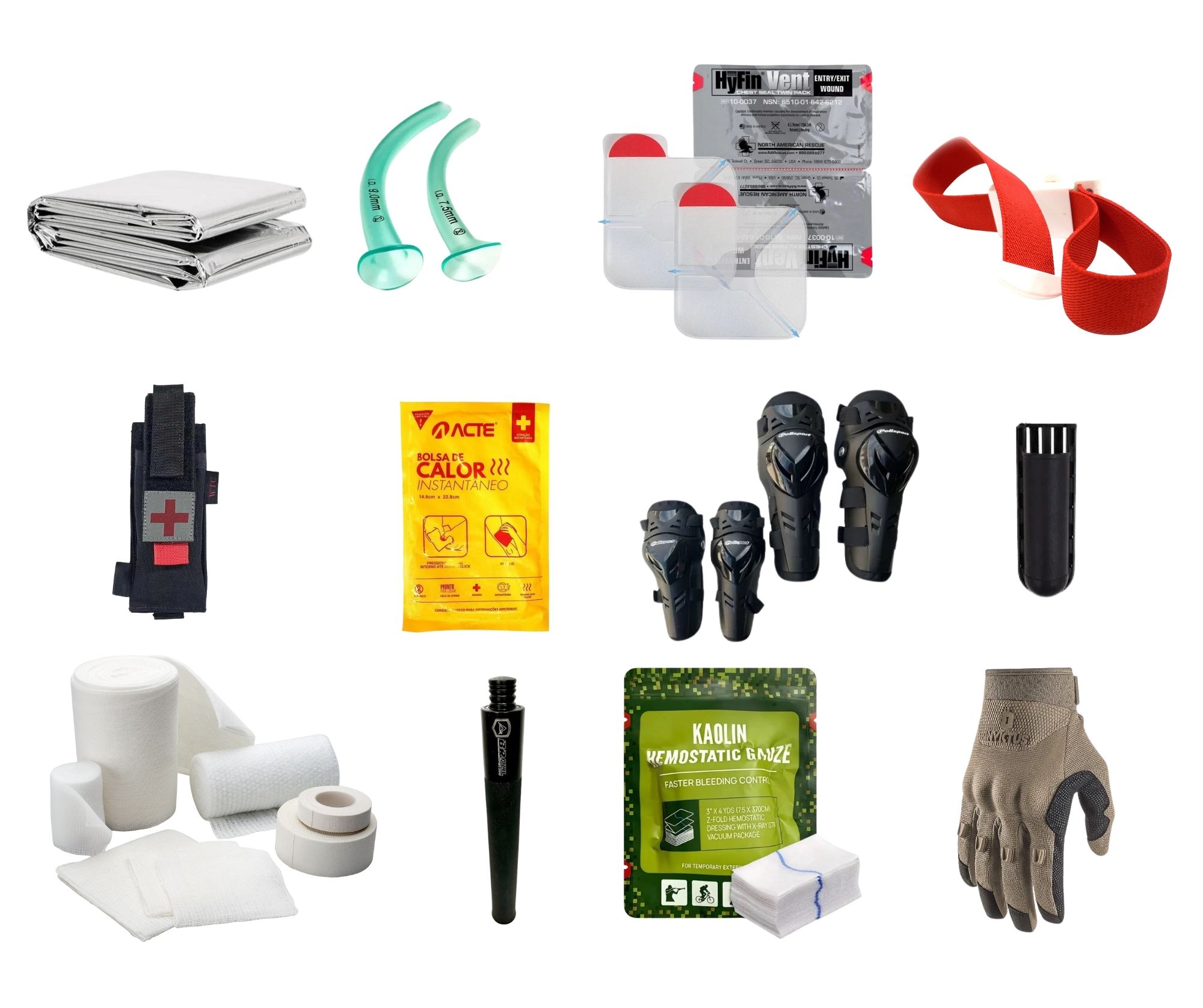 Itens de Custeio (óculos, joelheira e cotoveleira, luva, bastão e porta bastão, torniquete e porta torniquete, kit APH, selo de tórax, gaze, manta, heat pack, tesoura)